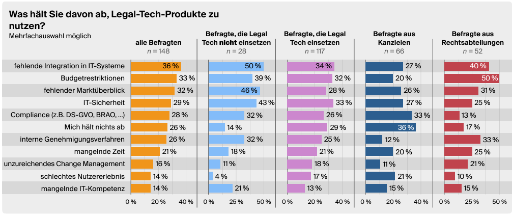 Unter allen Befragten ist es hingegen die fehlende Integration in IT-Systeme, die sie abhält. Doch auch dieser Grund ist für Kanzleien keine Ausrede: Wenn Sie sich etwa die Kanzleisoftware Legalvisio einmal ansehen wird klar, dass sie so intuitiv, schnell und unter ständiger Begleitung durch die Digitalisierungsexperten in ihr System integriert wird – Sie merken es wahrscheinlich kaum. Während Rechtsabteilungen hier lange auf Genehmigungen und Entscheidungen der Führungsebene warten müssen sowie aufpassen sollten, dass die Software zum Rest des Firmen-Systems passt, haben Kanzleien hier ein leichtes Spiel und können ohne Aufwand ihre Kanzlei in kürzester Zeit digital werden lassen.
