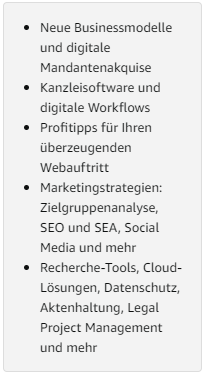 Wir zeigen Ihnen innovative Strategien, wie Sie im Internet gezielt Mandanten ansprechen und Legal Tech zur Optimierung Ihrer alltäglichen Arbeit einsetzen.