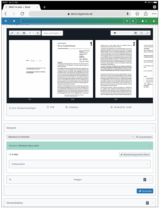 Sobald ein Schriftstück vollständig digitalisiert ist, kann es vom Postbeauftragten unter Angabe des Aktenzeichens an die E-Akte gesendet werden. Kanzleisoftwares haben für die Zuordnung neuer Dokumente verschiedene Lösungen, sodass sich die diesbezügliche Arbeit des Postbeauftragten auf ein Minimum beschränkt. In der Regel genügt die Angabe eines Aktenzeichens. Alle Dokumente, die von der Kanzleisoftware nicht zugeordnet werden konnten, werden entweder gemeldet oder finden sich an einem zentralen Auffangort zur weiteren Verarbeitung. Verloren geht nichts. Sobald eine E-Akte durch Hinzufügen eines neuen Dokuments aktualisiert wurde, bekommt der zuständige Anwalt bzw. dessen Sekretariat eine entsprechende Meldung über seine Agenda.