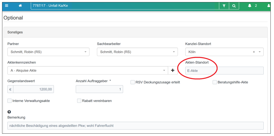 - Als Aktenstandort wird die E-Akte angegeben (siehe Abbildung 1)