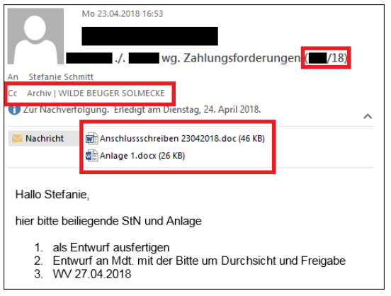 der Betreffzeile stehen und alle relevanten Anlagen der E-Mail beigefügt sind (siehe Abbildung 2).