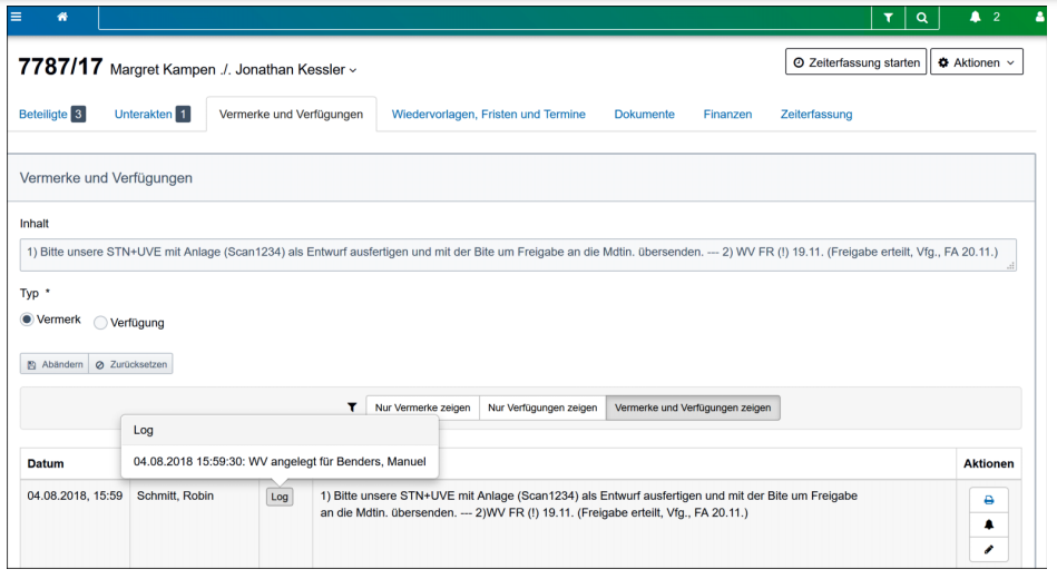 Verfügungen seitens der Anwälte erfolgen entweder per Outlook oder per Legalvisio-Aktenvermerk.