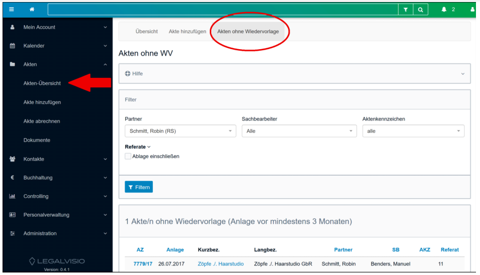 - Hier sollte regelmäßig (eventuell alle zwei Wochen bzw. alternativ einmal im Monat) über das Legalvisio-Tool Akten ohne Wiedervorlage geprüft werden, ob es Akten ohne Wiedervorlage gibt (siehe Abbildung 4).