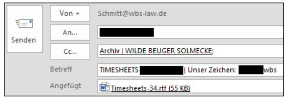 Timesheets-Listen angelegte Akte per E-Mail übersandt.