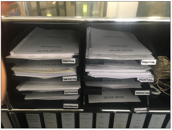 - Mit Ablauf der Woche werden die Ablagekästen geleert und die Dokumente nach ihrem Eingangsdatum archiviert.