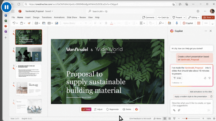 Nun kommt es im Hauptgeschäft eher selten vor, dass Anwälte tatsächlich PowerPoints erstellen müssen, doch bei immer häufiger werdenden Pitchs oder bei internen Besprechungen kommt es ja doch ab und zu vor. Nun muss kein Praktikant mehr damit beauftragt werden mal eben eine hübsche Präsentation aus dem 20-seitigen Word-Dokument zu erstellen. Dank 365 Copilot wird es die Funktion „Copilot“ geben, mit der sich eine Art Chat öffnet. Wie mit ChatGPT lässt sich nun mit Copilot als Chatbot interagieren. Ein Video von Microsoft zeigt: Einfach „Erstelle mir eine Präsentation aus dieser Quelle“ eingeben und schon hat man innerhalb von weniger als 1 Sekude die gesamte Präsentation aufbereitet, samt Bildern und Quellen. Nun kann man Anpassungen vornehmen, oder von vorneherein „Beibehalten“ anklicken – fertig! Eine Präsentation ist zu lang? „Kürze diese Präsentation um x Seiten, aber lege den Fokus auf y.“