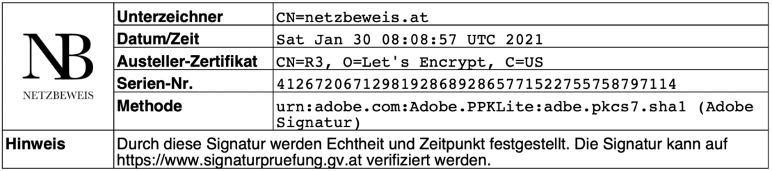 Netzbeweis ruft die angegebene Seite auf und erstellt einen Screenshot der Seite, der in einem Bericht festgehalten wird. Derzeit ist NetzBeweis für öffentliche Twitter Postings und Kommentare optimiert, funktioniert aber auch für viele andere Webseiten. Der Bericht wird elektronisch signiert, wodurch der Abrufzeitpunkt angezeigt wird, und dass der Inhalt nicht verändert wurde.